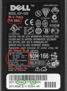 - Podle následujícího obrázku urcete, zda byl napájecí adaptér vyroben spolecností Delta Electronics a zda je oznacen jedním z následujících císel (9364U, 4983D nebo 7832D).